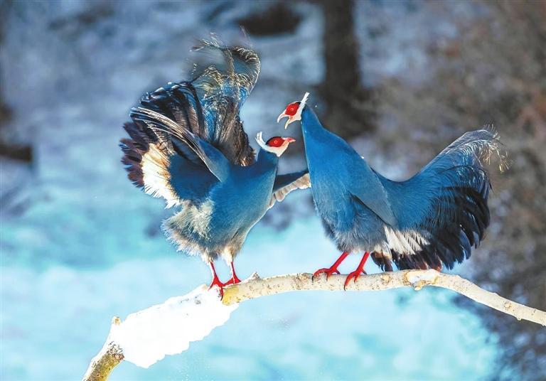 藍馬雞是珍稀名貴的禽類,頭側緋紅,耳羽簇白色、突出于頸部頂上,通體藍灰色,中央尾羽特長而翹起,尾羽披散下垂如馬尾,故名藍馬雞。冬日里,藍馬雞成群飛落山腳覓食,藍羽丹頂行走在雪地上格外搶眼。數量繁多的藍馬雞是祁連山野生山地雞的“顏值擔當”。覓食時,藍馬雞常用爪刨挖林中空地苔蘚和林緣草地,尋找掉落的云杉種子。刨食的過程會讓土壤松動,便于種子生根發芽,促進林區植物天然更新。