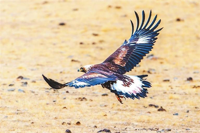 金雕以其卓越的捕獵技巧和優雅的飛行姿態而聞名,主要棲息于高山草原、森林及河谷地帶。在祁連山遼闊的草原之上,金雕展開它那寬闊且有力的雙翅,在藍天之中肆意翱翔。陽光傾灑下來,深褐色的羽毛閃爍著如同金屬般耀眼的光澤,猶如披上了一件堅不可摧的鎧甲,威風凜凜。它那犀利的眼神,仿佛能夠穿透重重迷霧,洞察這片廣袤土地上的每一個細微變化,盡顯王者風范。它身姿雄偉而威嚴,宛如一位至高無上的王者,向整個世界展示著它那不容小覷的力量與威嚴,默默地守護著這片廣袤無垠的草原天地。