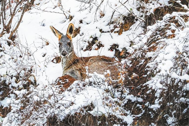 攝影師鏡頭下,一只馬麝安然臥在雪地上,它的耳朵偶爾會輕輕抖動一下,像是在用心傾聽著風中傳來的細微聲響。它優美的身形與周圍的景色完美融合在一起,寧靜而祥和。