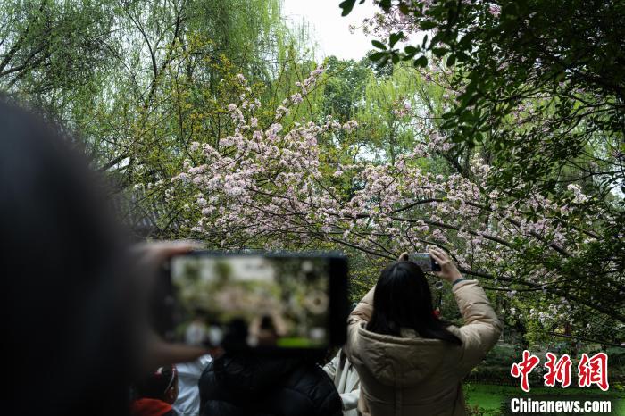 圖為3月16日,棠湖公園內,垂絲海棠盛開,市民爭相拍照打卡。韓金雨 攝