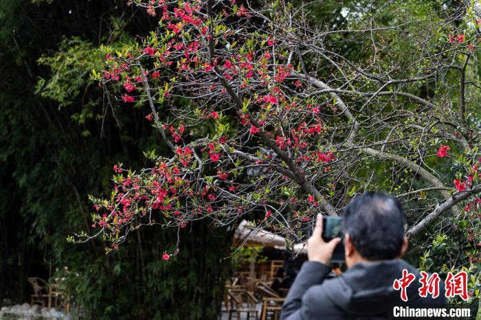 圖為3月16日,棠湖公園正大門處,垂絲海棠盛開,市民在此拍照打卡。韓金雨 攝