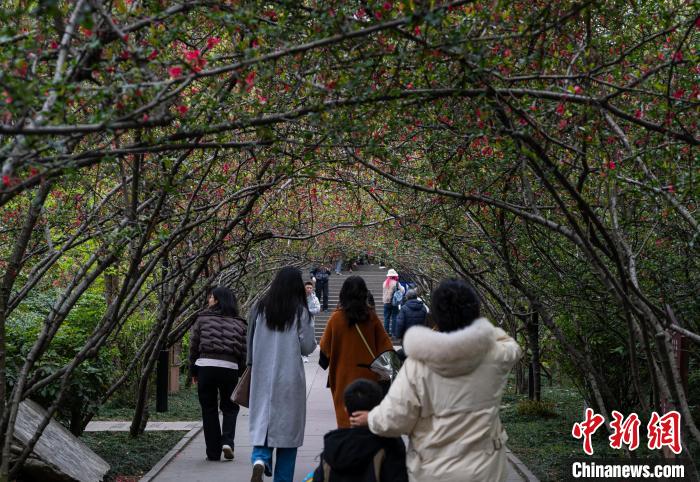 圖為3月16日,市民行走在棠湖公園內的“海棠花道”上。韓金雨 攝