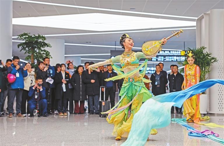 3月20日,在T3航站樓國內到達層,文藝工作者為旅客表演經典舞劇《絲路花雨》片段。