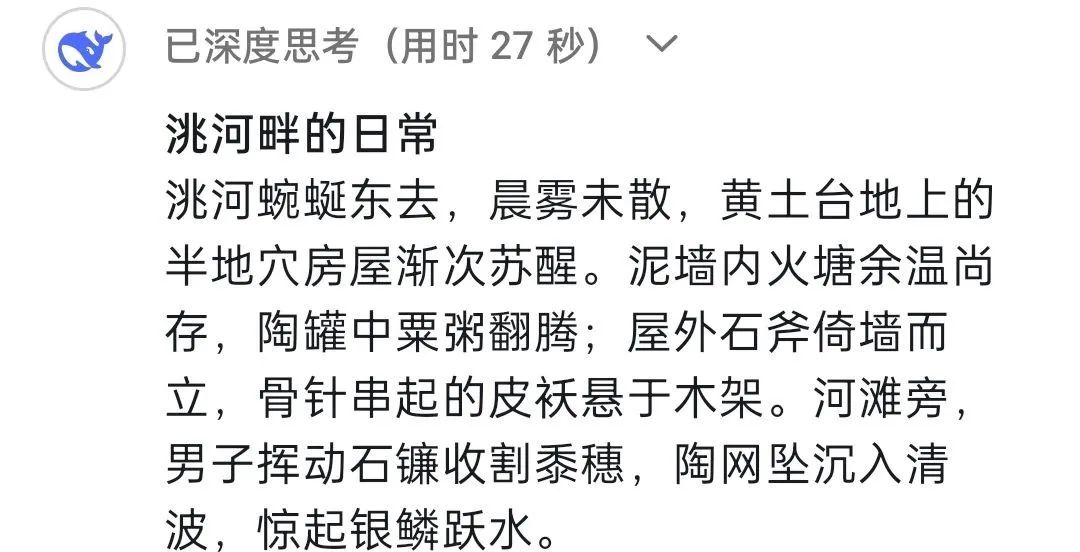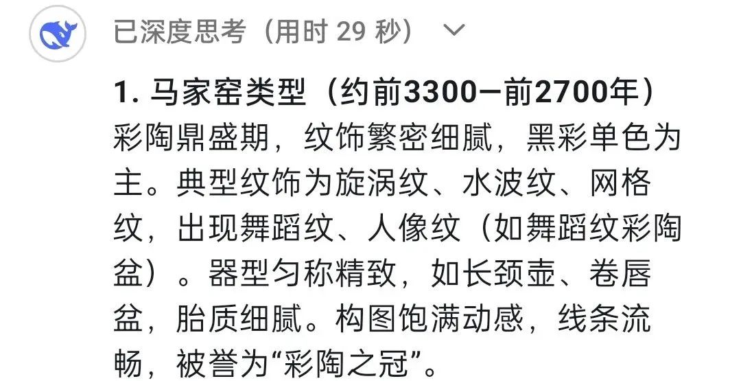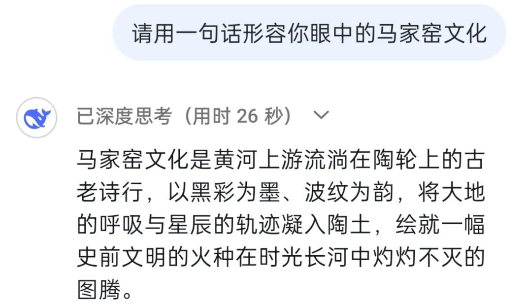 DeepSeek:馬家窯文化作為人類文明長河中一顆璀璨的明珠,因最早發現于甘肅省臨洮縣馬家窯村而得名,它被認為是仰韶文化向西發展的延續,它展現了黃河上游先民的創造力,更是史前人類與自然對話、與社會共生的見證。