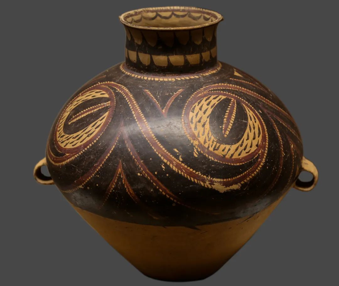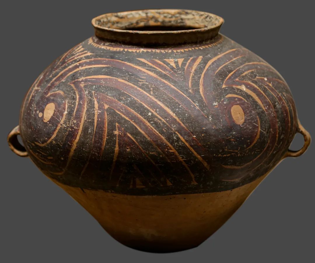 旋渦紋由黑彩繪制的螺旋線條構成,線條從中心向外延伸,形成連續旋轉的幾何圖案。多見于陶罐腹部或盆沿,線條粗細均勻,疏密排列規律,常與波浪紋組合,呈現動態視覺效果。