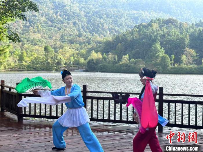 2024年11月,贛南采茶戲演員在江西贛州安遠縣三百山景區表演采茶戲。(資料圖)安遠縣采茶戲保護傳承中心 供圖