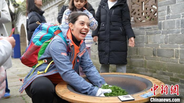 3月30日,來自巴西的游客奧莉薇體驗炒茶。 朱海升 攝