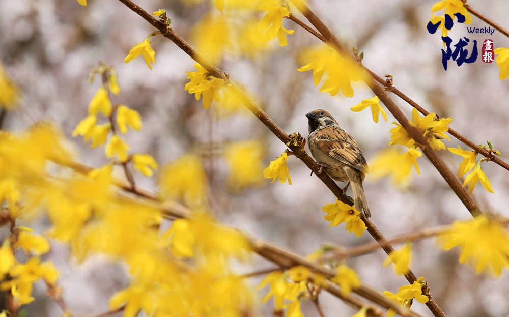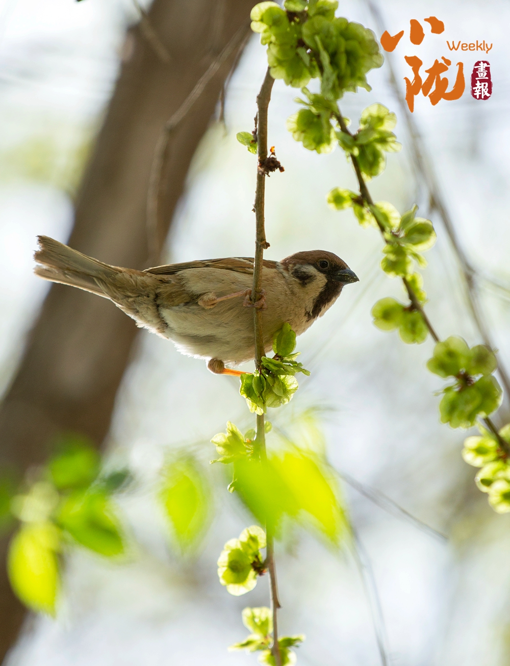 微風輕拂,花朵搖曳生姿,樹葉隨風起舞,榆枝上站著幾只小巧玲瓏的小精靈,它們身披黃黑相間的羽毛,尖尖的小嘴一張一合,歡快地唱著歌,仿佛在為春天的到來歡呼雀躍。
