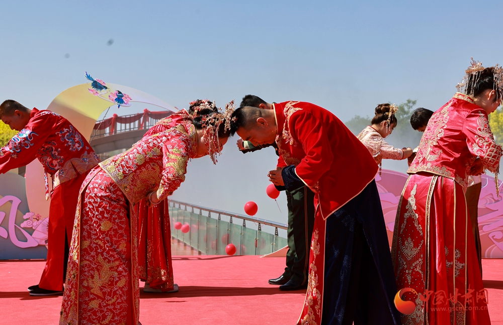 活動現(xiàn)場,古色古香的布置與悠揚婉轉(zhuǎn)的禮樂相得益彰。參加集體婚禮的新郎、新娘走過連心橋,共同牽繡球入場,舉行拜天地、行合巹禮等傳統(tǒng)儀式,一揖一禮間盡顯中式婚禮的莊重典雅與浪漫情懷,每一個環(huán)節(jié)都飽含著對新人的美好祝福。