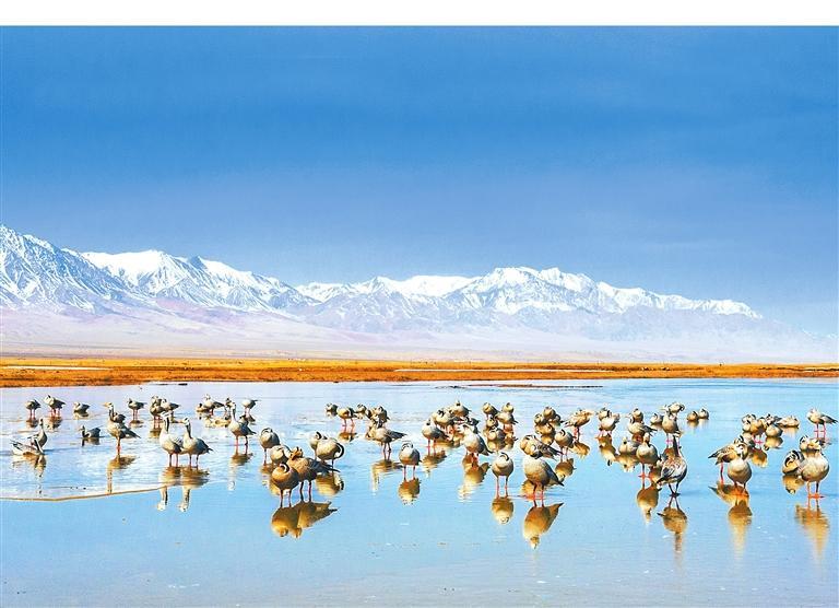 當祁連山的雪線以肉眼難以察覺的速度后退時,鹽池灣的冰封鏡面開始出現裂紋。最先感知到這一變化的不是融水沖刷出的溝壑,而是斑頭雁黃色的喙。它們在三月底的晨昏線上劃過,雙翅呼呼生風。冰凌碎屑尚未與雁羽摩擦,便已發出細密的簌響,像是古琴開弦前的調音。野馬南山與黨河南山兩山之間形成的盆地內河流縱橫、湖泊密布,草甸、沼澤交錯,是斑頭雁和其他水鳥世代棲息繁衍的場所。盡管先頭部隊在3月下旬就已抵達這里,主力部隊卻要到4月上旬才會姍姍來遲。此時斑頭雁幼體已在越冬地充分發育,羽衣上幾乎看不到如苔蘚般斑駁生長的新羽,只是頭部的兩條黑帶不如父母深邃,這是它們少經風霜的證明。它們降落在濕地灘涂時,雝雝鳴雁,那聲音或許與兩千年前蘇武牧羊時在北海之畔聽到的有些許相似。