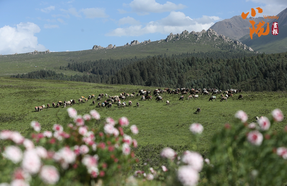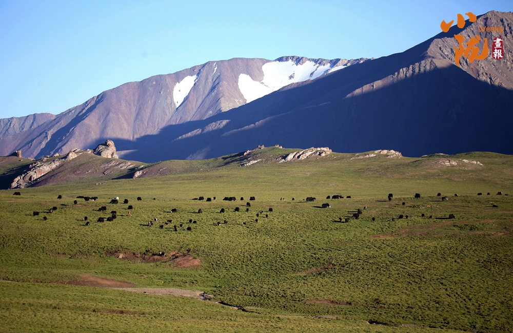 初夏時節,祁連山國家公園張掖肅南縣境內,天空湛藍如洗,草原碧綠廣闊,巍峨的雪山仿佛插入云端,牛羊在青草中覓食,勾勒出一幅天然秀麗的生態畫卷。