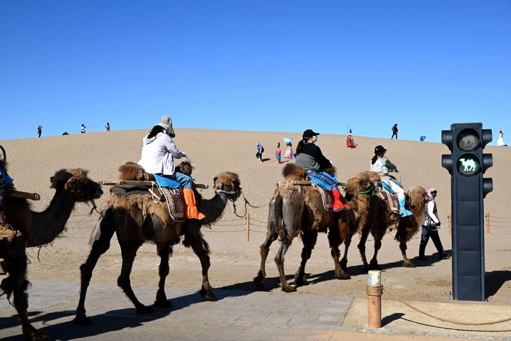 5月24日,敦煌市鳴沙山月牙泉景區的交通信號燈“綠駱駝燈”亮起時,農戶牽著駱駝有序通過。敦煌市鳴沙山月牙泉景區設置具有駱駝元素的交通信號燈,保障了景區交通安全順暢。新華社發(張曉亮攝)