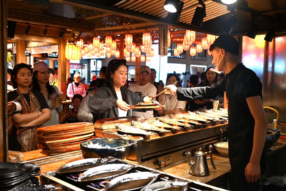 5月24日晚,游客在敦煌夜市沙州食驛選購美食。新華社發(張曉亮攝)