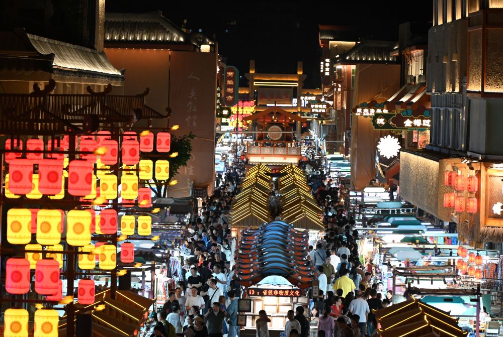 5月24日晚,游客在敦煌夜市商業街游覽。新華社發(張曉亮攝)