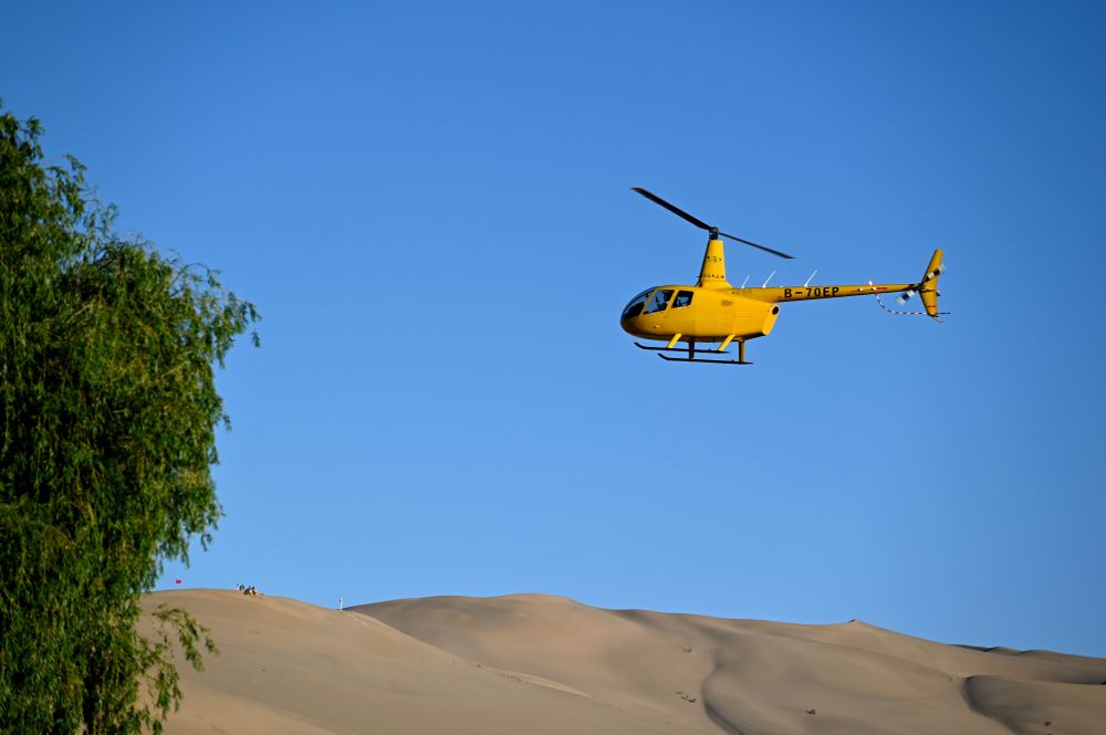 5月24日,在敦煌市鳴沙山月牙泉景區,游客乘坐直升機從空中欣賞大漠風光。新華社發(張曉亮攝)