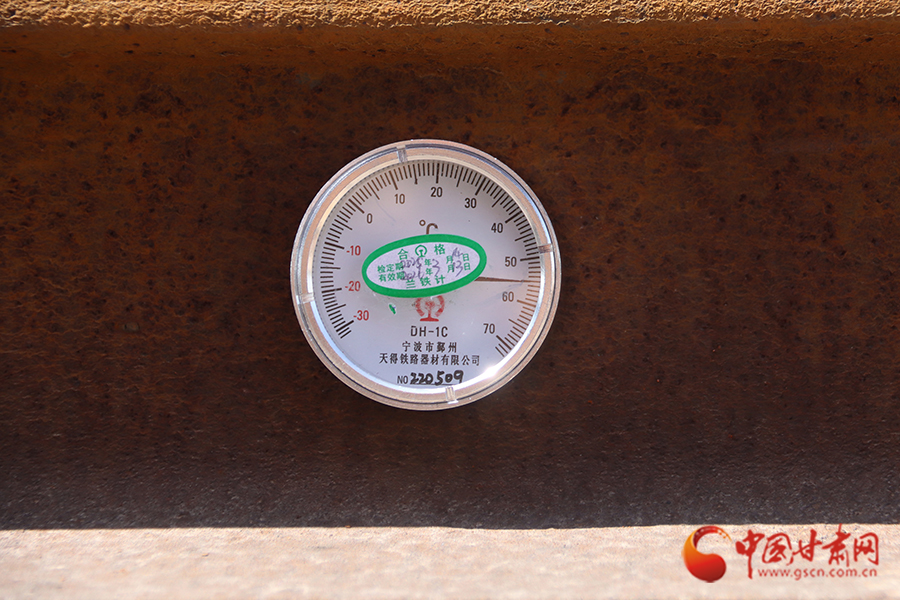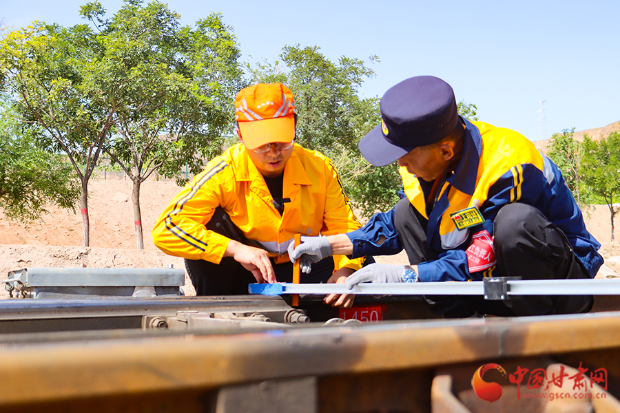 “樊工長,測一下此時的軌溫是多少?”到達(dá)蘭州北編組站下行到達(dá)場后,劉亞雄一邊擦拭著額頭不斷滾落的汗珠,一邊向樊勇喊道。樊勇熟練地將軌溫計貼在軌腰上,金屬表盤上的指針猶如上了發(fā)條,瞬間直飚半圈定格在54℃!
