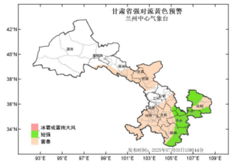 蘭州中心氣象臺2025年7月3日10時44分繼續發布強對流黃色預警:預計未來24小時,張掖、金昌、武威、蘭州、白銀、甘南、臨夏、定西、隴南、天水、平涼、慶陽等州市有雷暴,其中隴南、天水、平涼、慶陽等市部分地方及白銀、定西兩市局部地方有短時強降水,最大小時雨強20-60mm;隴南、天水、平涼、慶陽等市強降水在未來24小時內多發,白銀、定西主要強降水時段在4日2-8時。請注意防范!