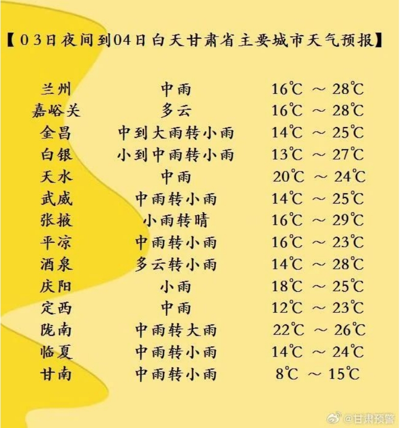 今天夜間到明天白天(7月3日20時-7月4日20時),酒泉、嘉峪關、張掖三市多云間陰,局部地方有小雨,祁連山區有中到大雨;省內其余地方陰有小到中雨,其中隴南、天水、平涼、慶陽等市局部地方及定西、甘南兩市州東部、白銀市南部有暴雨。