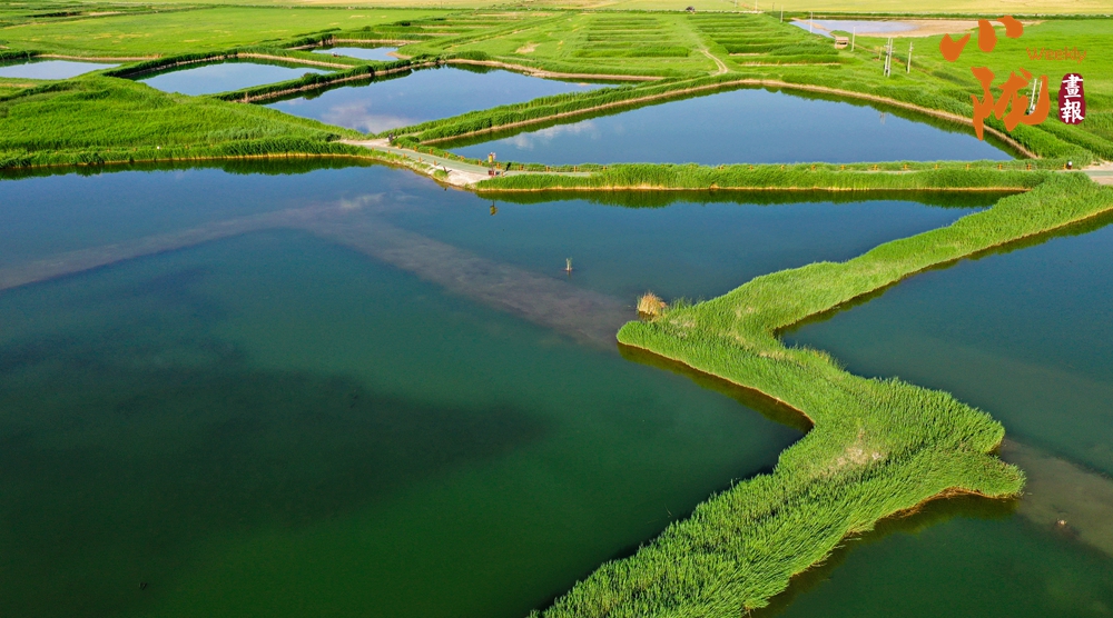 湖邊,蘆葦綠意盎然,隨風泛起綠色的波浪,染翠了整個草湖。每當風兒掠過,這些層層疊疊的綠意散發出沁人肺腑的草木清香。在這樣炎熱的日子里,看看這樣清澈的綠,夏天好像變得清涼起來。