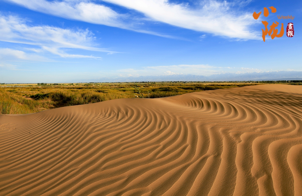站在綠洲與大漠的結合處,觀賞四方風景,眼前奇異的景致讓人驚嘆萬分:一邊是莽莽蒼蒼、雄渾博大、無邊無際的大漠海洋,一邊是郁郁蔥蔥、娟秀嫵媚的綠洲碧野。這是大自然杰出的造化,這黃色與綠色之間沒有任何過渡,兩色卻形成鮮明的對比,宛如畫家手下的色盤,黃綠分明、對比強烈而又和諧統一,令人叫絕。