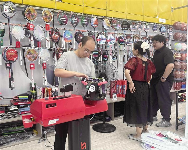 不僅如此,運動用品銷售也迎來小高峰。瑞德摩爾太平洋商場內的健雄體育用品店內,老板正忙著給羽毛球空拍穿線。“我們不僅有現成的羽毛球拍,還可以根據客戶的需求給空拍穿線。”該店老板介紹,羽毛球拍網線價位30至100元不等,購線還可免手工費。羽毛球初學者一般都會買成品拍自己在家練習,而一些技術較好的顧客除了會選擇品質較好的空拍,還會現場選線拉網定制屬于自己的球拍。“暑假以來,店內羽毛球拍銷量大增,穿線需求也逐漸增多,周末從早忙到晚,每半小時穿一個球拍,最多一天穿24個,排隊等候已成常態。”此外,不少運動品牌也順勢推出促銷活動,吸引消費者選購。