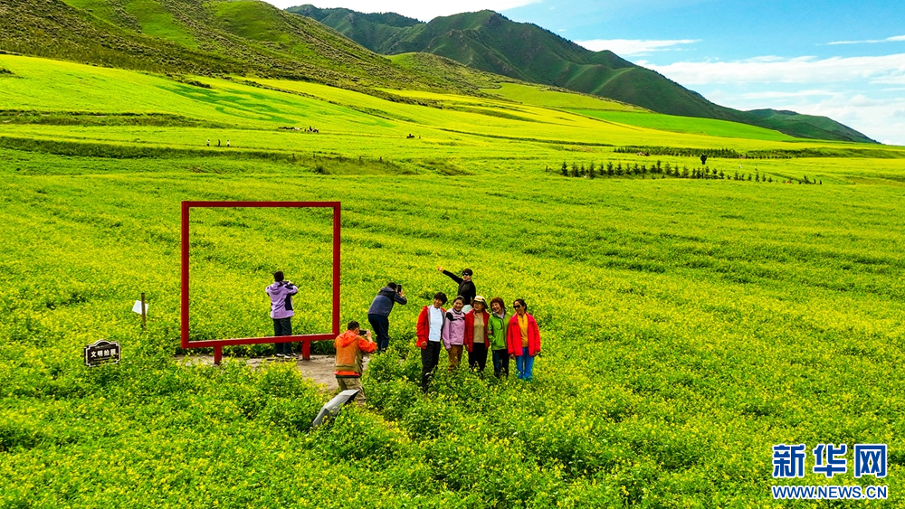 連日來,位于祁連山下的甘肅省張掖市民樂縣扁都口景區萬畝油菜進入盛花期。金黃的油菜花海與草原綠野相連,空氣中彌漫的淡淡花香,醞釀山川,醉了游人。新華網發(王將 攝)