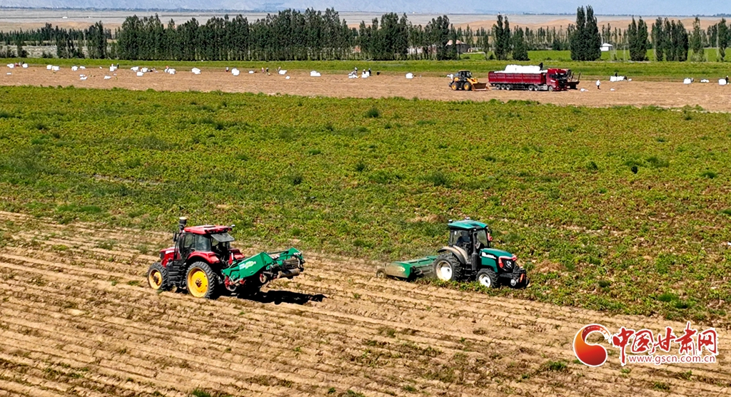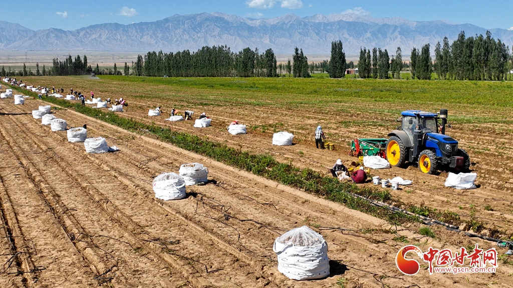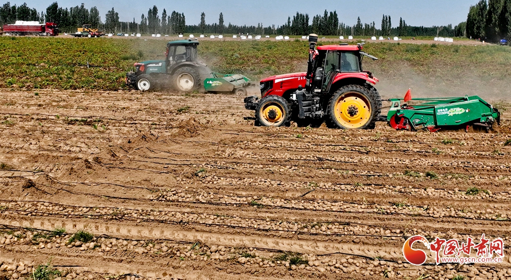8月14日,祁連山下的張掖市高臺縣新壩鎮馬鈴薯種植基地一片繁忙。收獲機在田間穿梭,碩大的馬鈴薯破土而出,工人們正加緊進行撿拾、分揀和裝車。