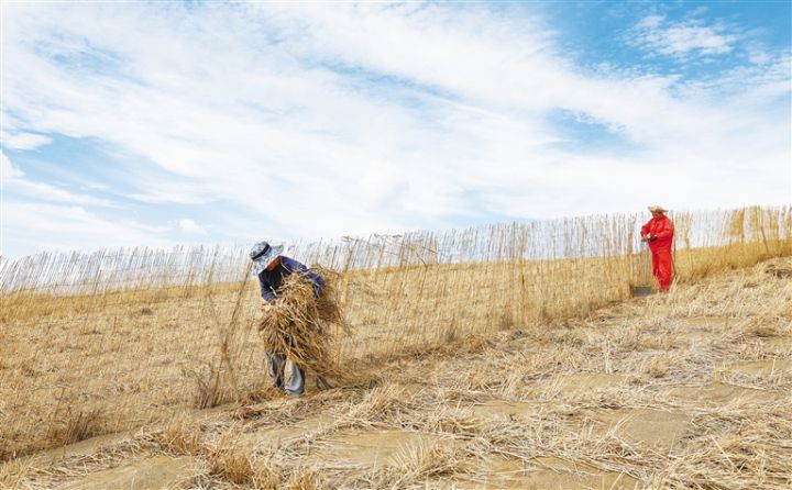 近日,在金塔縣黑河中游防沙治沙林草綜合治理項目固沙現場,工人在起伏的沙丘上或鋪設草方格沙障,或搭建高立式沙障,努力為沙漠邊緣的綠洲、城市筑起屏障。