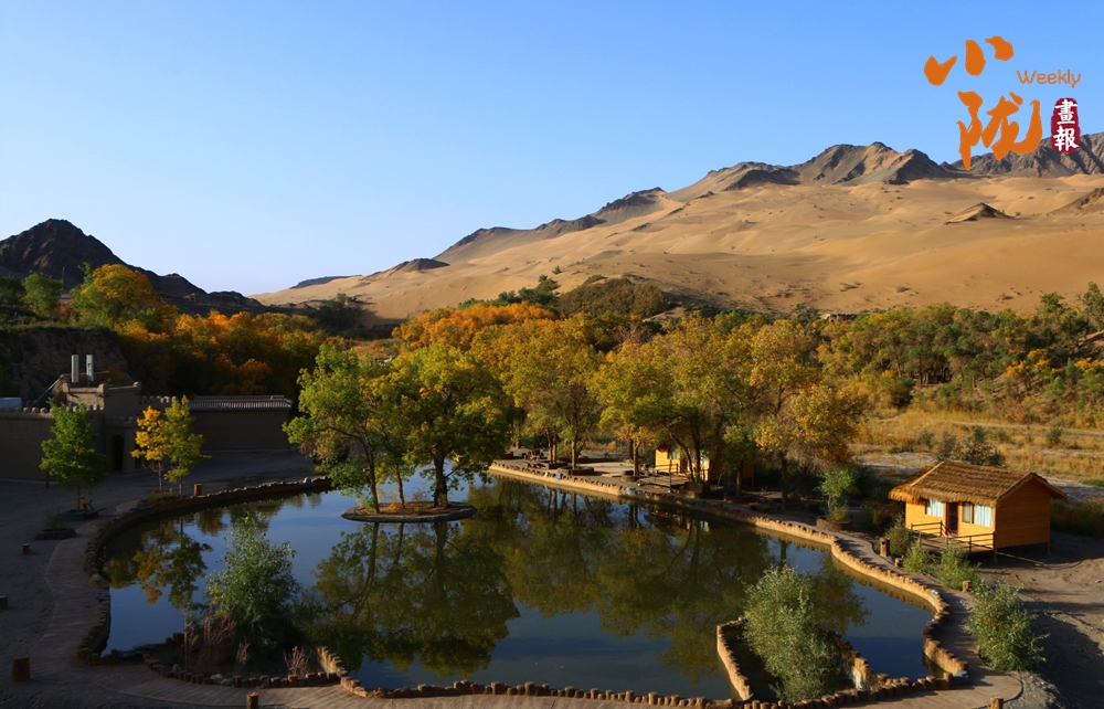 連綿起伏的沙丘如金色浪潮,環抱著一汪碧水,藍天白云倒映其中。金黃的胡楊在秋風中輕輕搖曳,宛如一群身著華麗服飾的衛士,默默守護著這片沙漠中的綠洲。