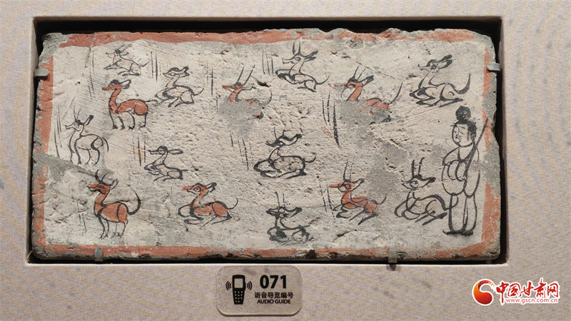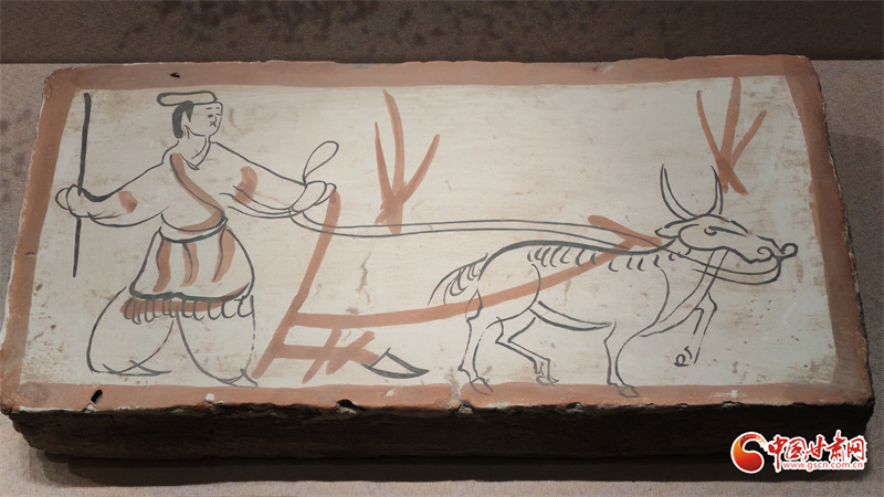 在博物館的“古冢丹青——高臺魏晉十六國時期墓葬壁畫藝術陳列”展廳里,記者看到,《二牛耕地畫像磚》生動再現了當時的農耕技術:兩頭耕牛架著直轅犁,后隨的男子一手扶犁一手揚鞭,展現了典型的“二牛抬杠”耕作方式。《牧鹿圖壁畫磚》則描繪了古人放牧鹿群的獨特場景,為研究當時的畜牧業發展提供了珍貴資料。