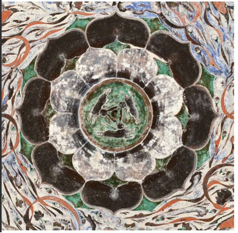 踏入窟內,仰頭凝望,藻井中央那朵八瓣蓮花宛如夜空中綻放的星辰,花瓣層層疊疊,細膩而生動。蓮花中央,是獨具匠心的三兔連耳圖案。