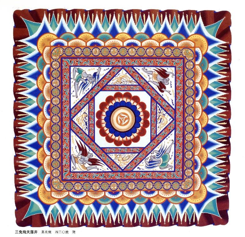 三兔共耳圖案、成熟的飛天造型、精美的紋飾圖案相互映襯,共同構成了這幅令人嘆為觀止的藻井壁畫,受到人們的廣泛關注和喜愛。