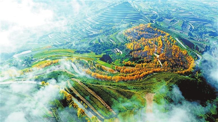 秋日的隴西縣柯寨鎮虎家屲村,云霧似輕紗裹滿山巒,村落與林帶隱入煙靄之間——黃土高原上世代耕耘出的“大地藝術”,正將自然意趣與煙火溫情,暈染成一幀秋日的水墨詩行。