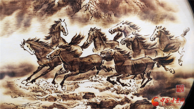 經過燙烙、烤彩等特殊工藝處理,他的作品不僅保留了傳統烙畫的浮雕效果,更在色彩上實現突破:畫面或簡潔典雅、或濃烈鮮活,層次豐富且色澤持久,題材也拓展到人物、花鳥、風景及民間吉祥圖案,《奔騰的山丹馬》《絲路風情》等代表作多次在省、市藝術展覽中獲獎,還成了收藏家青睞的珍品。