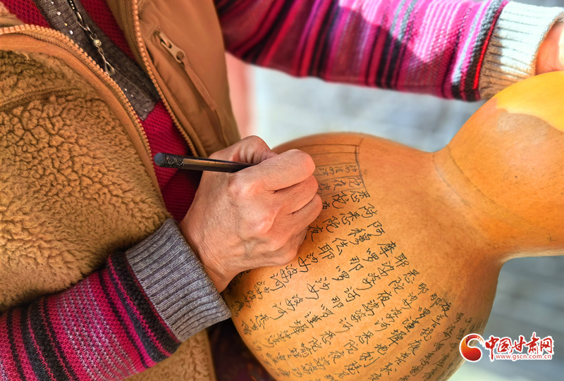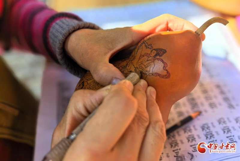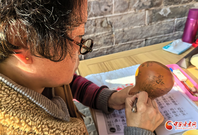 深秋的午后,陳兵手持刻刀,在小小的葫蘆上精雕細琢,仿佛在與時光對話,將一個個美好的愿景都鐫刻其中。